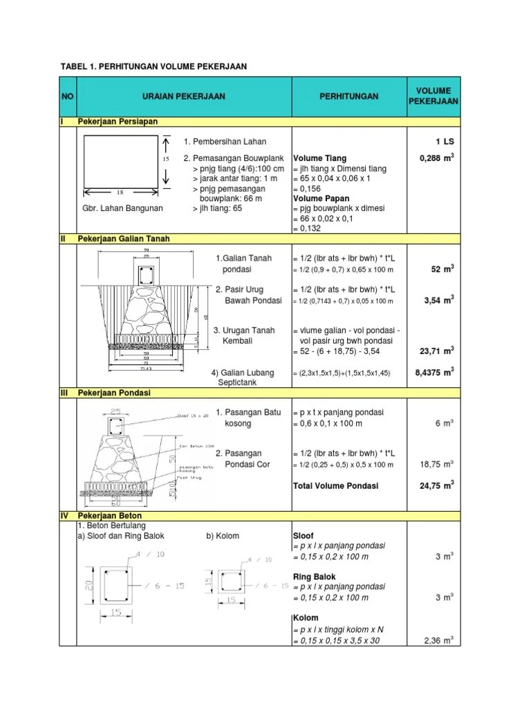 Berikut ini cara menghitung volume material pondasi batu kali, pondasi digunakan sebagai penahan rumah atau bangunan sehingga konstruksi . Dalam hal ini, anda harus menghitung mengenai panjang pondasi, lebar atas, lebar bawah, ketinggian, dan volume pondasi disetiap meter. Simak ulasan hitungan volume pondasi . Hitung volume pasangan batu yang berbentuk trapesium dengan rumus : ((lebar atas + lebar bawah) / 2) x tinggi pondasi x panjang pondasi.